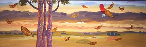 These recent works give a surrealist aura in a realist setting. The mountains, the sky, the flying golf balls, and the falling leaves of various colors provide audiences with a feel of autumn and inner joy.
