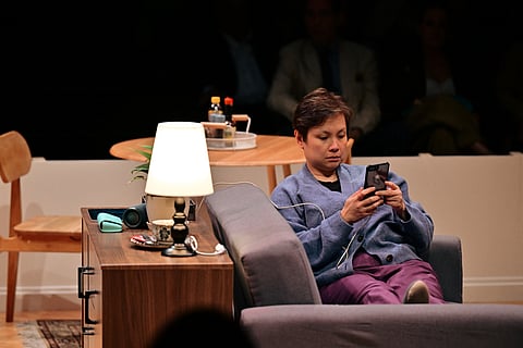 The Samsung Performing Arts Theater creates an intimate black-box experience, with the audience surrounding the woman’s small apartment like voyeurs peering into her life. We witness her mundane routines: cooking rice, reheating food, and perusing the mail — catalogs, with no letters from friends or family.