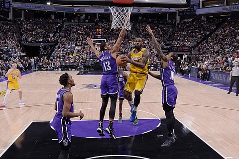 James broke the NBA all-time minutes played record that had belonged to Kareem Abdul-Jabbar when he was on the court for his 57,447th minute of NBA competition and 10th of the game in helping the Los Angeles Lakers beat Sacramento, 113-100.