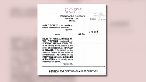 A copy of the petition showed Senate President Francis “Chiz” Escudero, House Speaker Ferdinand Martin Romualdez, and House Secretary General Reginald Velasco were named as respondents.