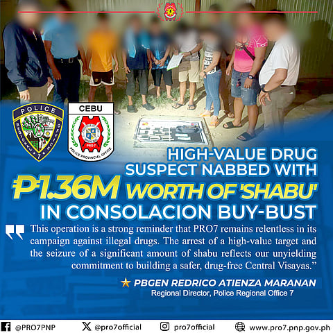 Three alleged drug personalities, including a high-value target, were arrested, and approximately P1.36 million worth of suspected shabu was seized during a buy-bust operation in Barangay Garing, Consolacion, Cebu, on 5 June.