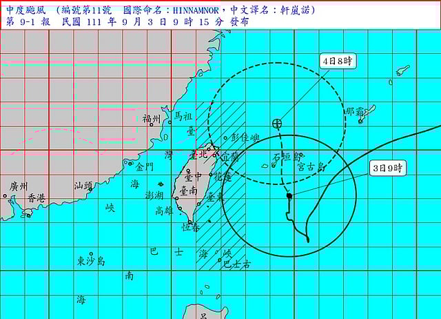 Hinnamnor will have its strongest effect on Taiwan from Saturday evening to Sunday (Sept. 4), per the CWB, which has issued an Extremely Heavy Rain Advisory for Keelung, Taipei, New Taipei, and Taoyuan cities as well as Hsinchu, Miaoli, and Yilan counties. The bureau also issued Heavy Rain Advisory for Hsinchu and Taichung cities, as well as Changhua County.