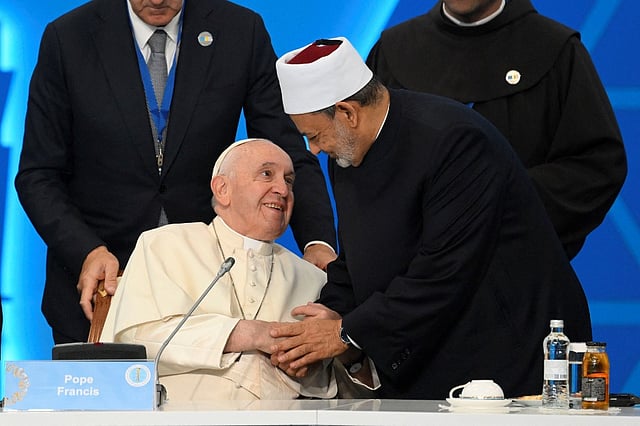 Pope Francis and Egyptian Islamic scholar and the current Grand Imam of al-Azhar mosque, Sheikh Ahmed Al-Tayeb, greet each other during the VII Congress of Leaders of World and Traditional Religions at the Palace of Peace and Reconciliation in Nur-Sultan, Kazakhstan, on 14 September 2022. (Photo by Handout / VATICAN MEDIA / AFP)