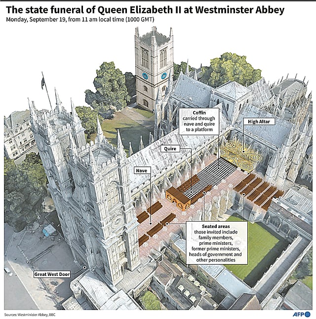 Queen Elizabeth's state funeral, the first in Britain since the death of her first prime minister Winston Churchill in 1965, will take place Monday at Westminster Abbey in London at 11:00 a.m. (1000 GMT).