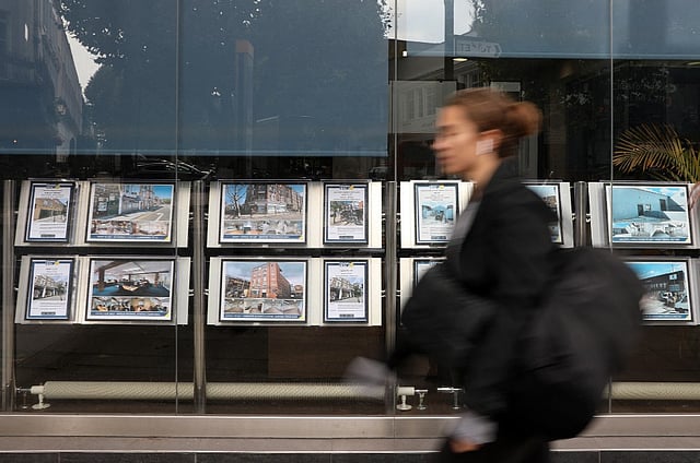 A pedestrian walks past residential properties displayed for sale in the of an estate agents' in London on 30 September 2022. Outgoing Prime Minister Truss resigned after her budget of tax cuts funded by debt sent shockwaves through markets, crashing the pound. (Photo by ISABEL INFANTES / AFP)