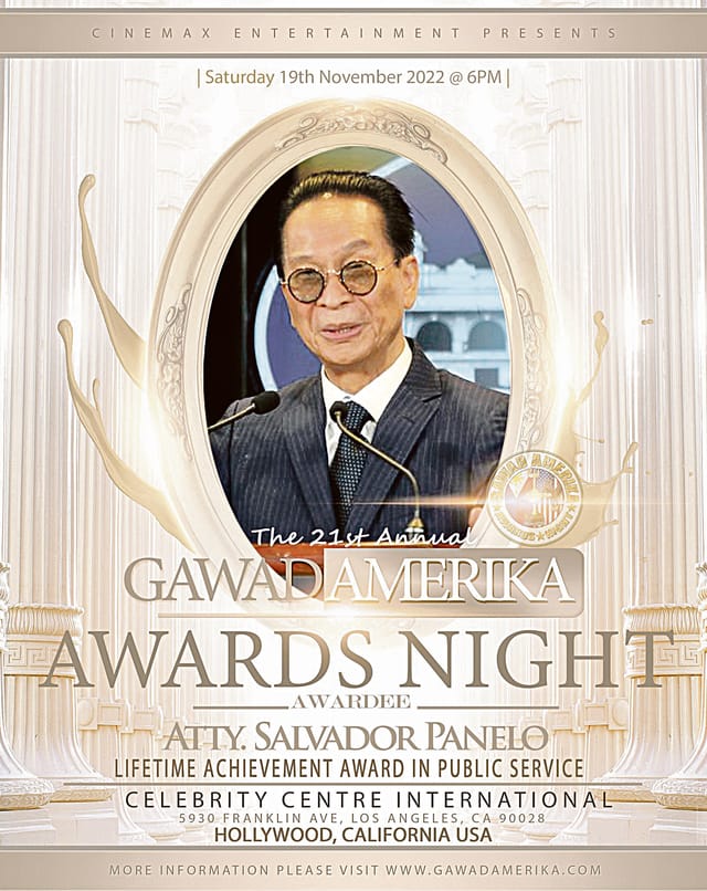 Former chief presidential legal counsel Salvador Panelo added another recognition to his long list of laurels after being named this year's recipient of the Gawad Amerika's Lifetime Achievement Award in Public Service.