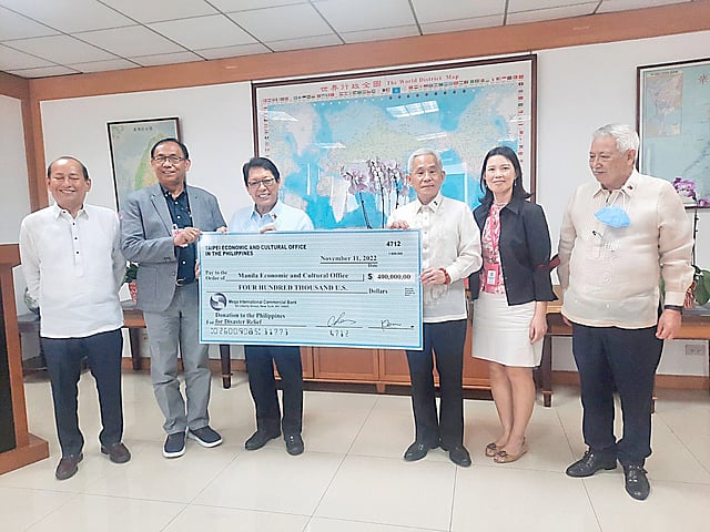 Taiwan, through the Taipei Economic and Cultural Office in the Philippines, donated $400,000 (P22.9 million) to the victims of tropical storm "Paeng" (international name Nalgae).