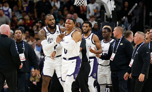 Westbrook jumped up, bleeding profusely, and charged toward Collins before James got his arms around Westbrook and, as they headed toward the bench, a held a towel to his forehead.
