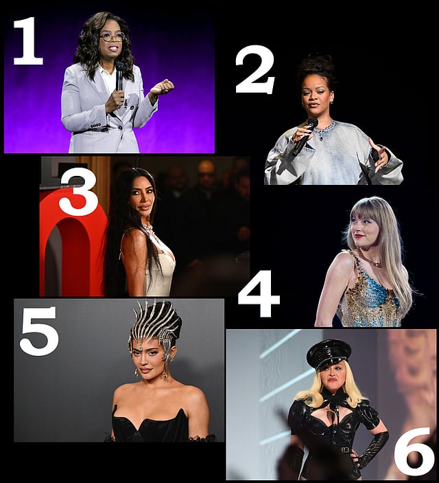 Next to the media mogul are R&B superstar Rihanna, with $1.4 billion net worth; reality TV actress Kim Kardashian, with $1.2 billion net worth; pop sensation Taylor Swift, with $740 million net worth; and social media personality Kylie Jenner, with $680 million net worth.