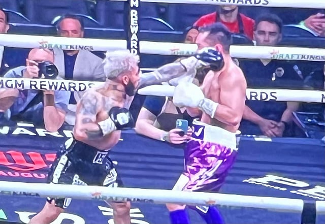 Alejandro Santiago scores against Nonito Donaire in their WBC bantamweight title fight in Las Vegas. Santiago won on points. (Photo by Dr. Ed Dela Vega)