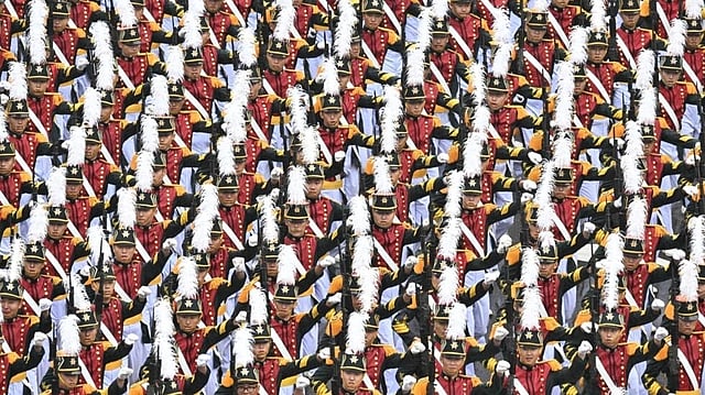 South Korean President Yoon Suk Yeol watched the parade from a platform, applauding troops as they marched past.