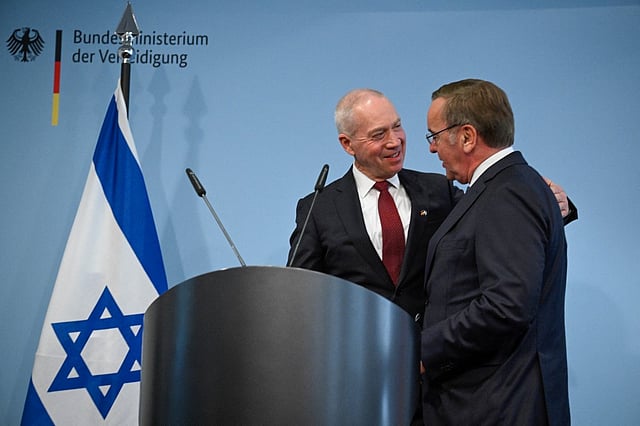 German Defense Minister Boris Pistorius (right) and Israeli Defense Minister Yoav Gallant embrace at the end of a press conference after signing a Declaration of Intent on the ARROW 3 missile defense project at the Defense Ministry in Berlin on 28 September 2023. (Photo by Tobias SCHWARZ / AFP)