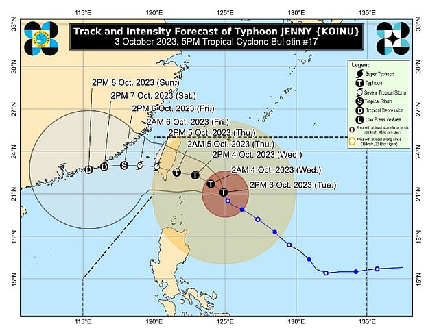On the track forecast, Jenny will make landfall over the southern portion of Taiwan between late Wednesday evening, or Thursday morning, then exit the Philippine Area of Responsibility between Thursday morning and afternoon.