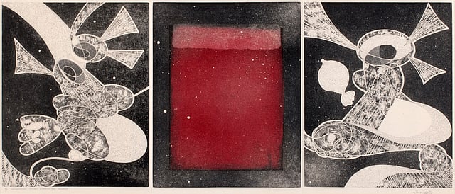The earlier artworks converse with the recent prints from the 20/30: A Limited Edition Print Portfolio, made in celebration of the CCP's fiftieth founding anniversary. The print folio project, while ideated before the start of the Covid-19 pandemic, has been a channel for the participating artists to deal with the difficulties of our time and to give back to the institutions that support printmaking practice.