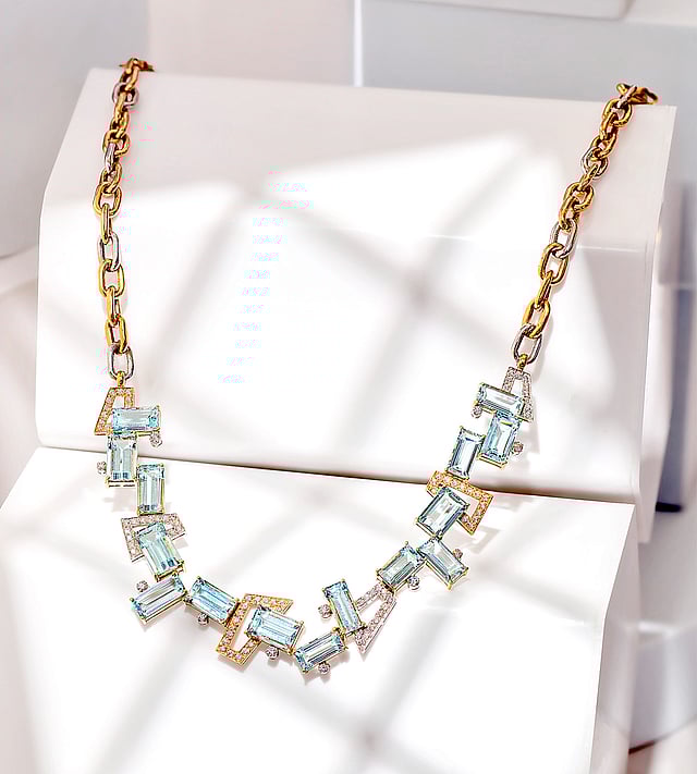 Emeralds evoke nature's tranquility, blue sapphires mirror the depths of the ocean's mysteries, rubies offer a glimpse of passion and intensity, and pearls bring a touch of classic elegance. Of course, diamonds will always be the highlight as it represents the ultimate symbol of sophistication. Special-cut peridots and aquamarines are a must for Dee, "for their unique color and cutting, as these are my birthstones and my son's as well."