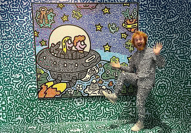 But for "Mr Doodle in Space" — a solo exhibition launched Thursday — her staff wallpapered her gallery in Cox's signature imagery, enveloping his canvases with an eye-popping pandemonium of scribbles.