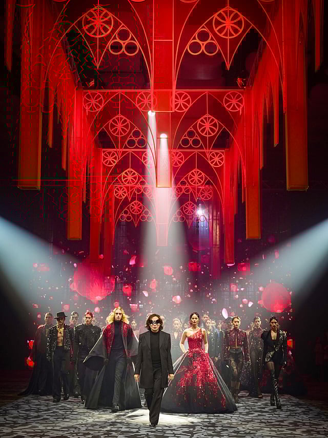 "The matador, representing mankind and dressed for his date with death in the fantastical if impractical traje de luz (suit of lights), goads, mocks and sentences the bull to death with the estocada, the death blow, from his sword," as per andalucia.com. In liquid satin and black and silver numbers, models dressed like Black Friars are in the "Monasterio de la Sagrada" suite. From their dark and severe tones, one can think of the dreaded Spanish Inquisition in this segment. But Cinco seemed to be inspired by the Roman Catholic minor basilica in Barcelona designed by Antoni Gaudí.