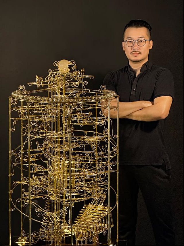 With his decades of practice in metallurgy and jewelry-making, he started to shape intricate and ornate sculptures in 2018. He translated his deep connection with the life force and energy into moving pendulums using semi-precious gems set in aurichalcum, a special metal alloy that the artist himself forged.