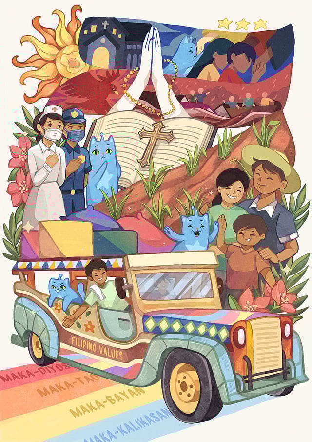 Young Boholano artist Anna Rina Oncog won first place with her interpretation of Filipino values as demonstrated in different sectors of society. Oncog wove Heneral Tuna into the different elements of Filipino culture such as the jeepney and pagmamano while highlighting the aspirations of being maka-diyos, makatao, maka-bayan and maka-kalikasan (godly, humane, patriotic and environmental).