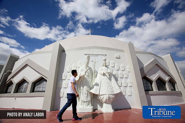 LOOK: A man walks past the statue of Pope Francis and the Virgin Mary seen at the top of Antipolo Cathedral in Antipolo City on Thursday, 25 January 2024. Antipolo Cathedral is set to be declared as the International Shrine of Our Lady of Peace and Good Voyage tomorrow, 26 January. Bishops and archbishops from all over the country are expected to attend the solemn ceremony.