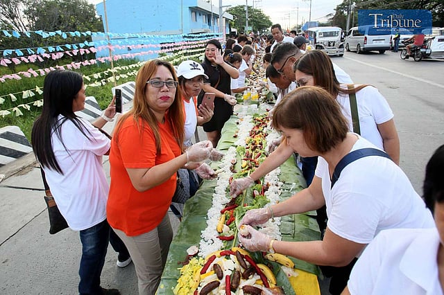 LOOK: Residents from 29 barangays of Calumpit, Bulacan, gathered to share in a 500-meter longganisa boodle fight laid out along the Calumpit-Pulilan Road, celebrating the 2nd year of the Calumpit Longganisa Festival and commemorating the town's 452nd founding anniversary on Saturday, 23 March 2024. The Calumpit Longganisa Festival aims to promote tourism in the town by highlighting one of Calumpit’s sources of pride and livelihood: garlic and sweet garlic longganisa. | via Analy Labor