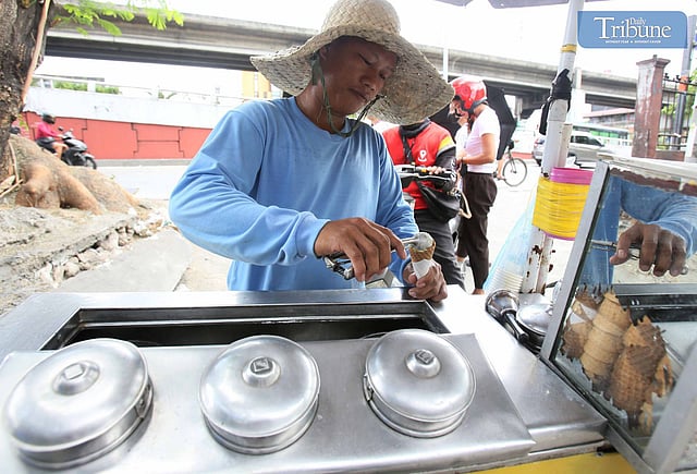 LOOK: A customer buys "sorbetes" or dirty ice cream, a popular dessert during summer, along EDSA in Quezon City on Sunday, 7 April 2024. | via Analy Labor