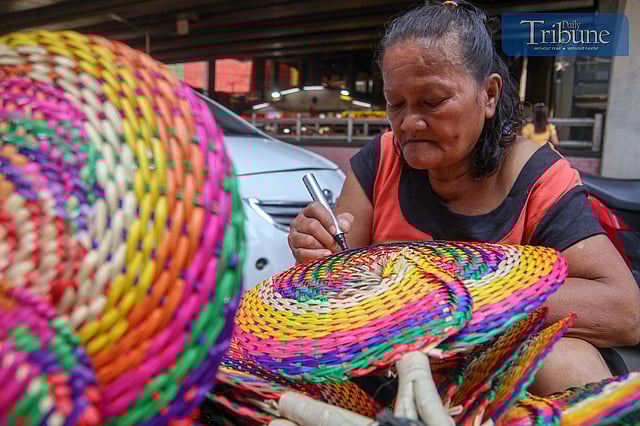 LOOK: Therese Bustamante, 64, sells colorful abaca fans amid the sweltering heat, along Taft Avenue in Pasay City.
