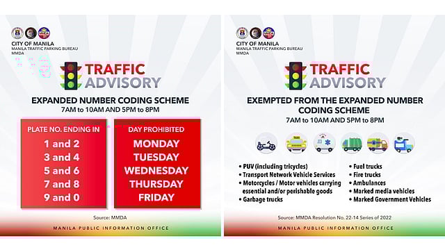 In a statement, the MMDA said that number coding scheme will be implemented from 7 a.m. to 10 a.m. and 5 p.m. to 8 p.m. Vehicles with plate numbers ending in 1 and 2 will not be allowed to use the roads.
