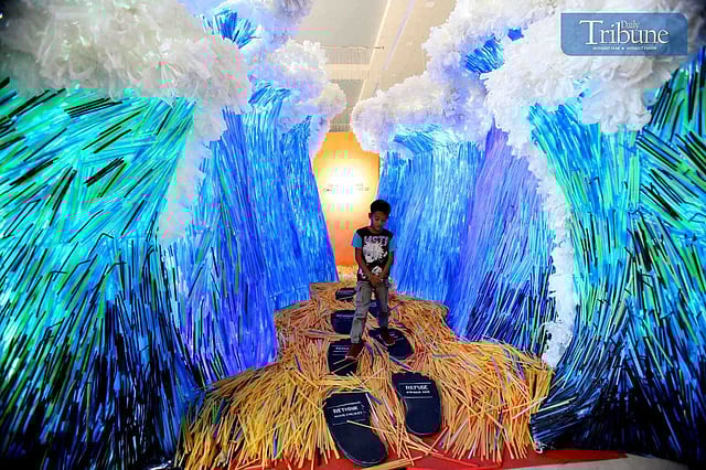LOOK: Artists put the finishing touches on an art installation titled 'THE WAVE OF CHANGE, PLASTIC-FREE QC,' currently on display in the Quezon City Hall Lobby, on Saturday, 20 April 2024. According to the artist group, the installation aims to provide a visual representation of the potential consequences if plastic use remains prevalent in the country. It also encourages fellow Filipinos to use alternative products instead of plastic, which is harmful to the environment. | via Analy Labor
