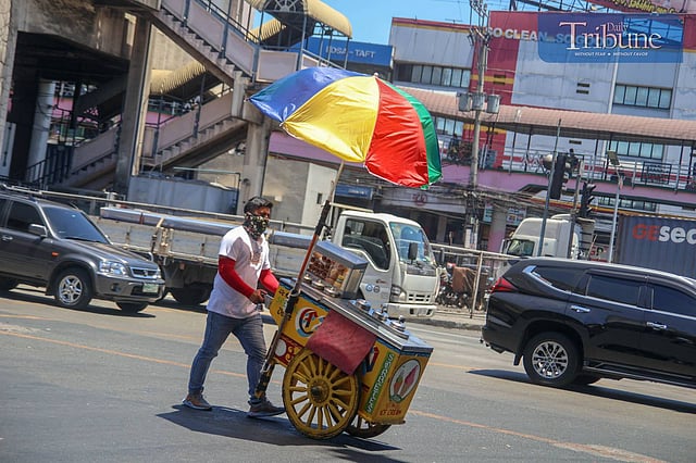 LOOK: A dirty ice cream vendor along EDSA-Taft while pushing his cart on Sunday, 28 April 2024. Every summer, bell sounds can be heard in Manila's streets, an indication of sorbeteros peddling around, offering sorbetes. Sorbetes, or ice cream ala-Filipino style, is usually sold on the streets in wooden push carts. | via Dianne Bacelonia
