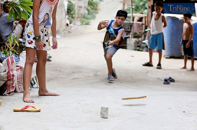 LOOK: Kids enjoy playing a Filipino traditional game of "tumbang preso", also known as "tumba lata" (knock down the can) or "bato lata", in Brgy. 178, Caloocan City, on Wednesday, 15 May 2024. | via Analy Labor