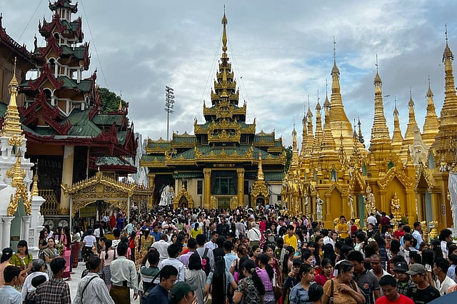Crowds shuffled up a roofed stairway crammed with stalls selling flowers, candles and incense to reach the hilltop complex that dominates the skyline of commercial hub Yangon.