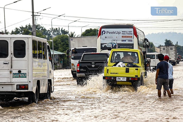 LOOK: Motorists experience gutter-deep flood along the roads of Bay, Laguna on 27 May 2024 brought by Typhoon Aghon. | via John Louie Abrina