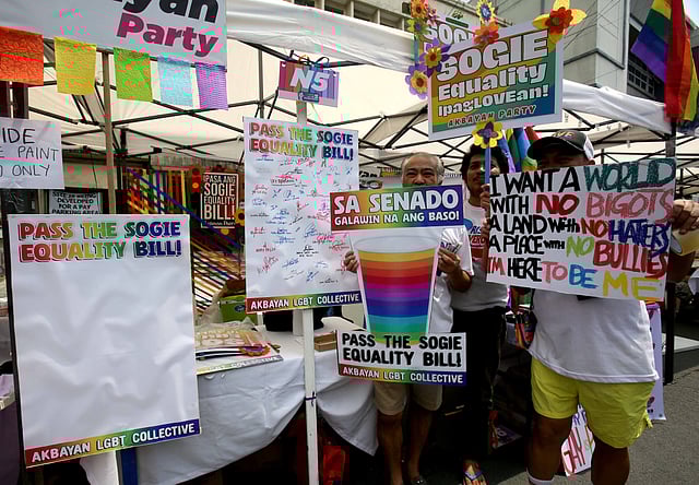 Akbayan and LGBTQIA members hold placards calling for the passage of the SOGIE (Sexual Orientation, Gender Identity, and Expression) Equality Bill at Matalino St. and Quezon City Circle in Quezon City, during the "Love Laban 2 Everyone!" Pride PH Festival 2024, on Saturday, 22 June.
