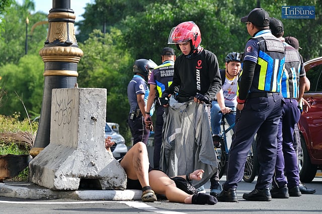 LOOK: A motor taxi rider Argie Abucay tends to a passenger who accidentally fell to the ground while back riding with him along Taft Avenue in Manila on Thursday, 4 July 2024. Not his fault because the passenger fell asleep as claimed by the rider; but the enforcer stated that even if it was not his fault, any mishap involving a car or motorcycle while driving is the driver's responsibility. The rider did not abandon his passenger, even following where the emergency responders carried her to the nearest hospital. | via KING RODRIGUEZ