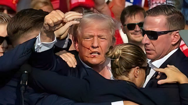 Ang kandidatong Republikano ay nagtaas ng kamao habang siya ay ibinababa sa entablado ng mga ahente ng United States Secret Service (USSS).