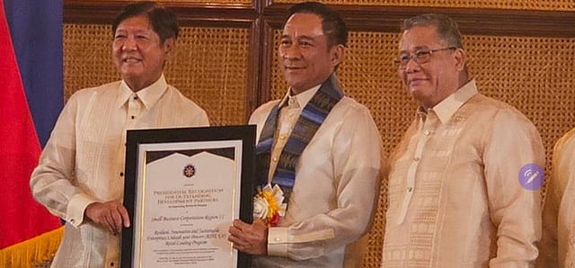State-owned Small Business Corp. (SBC), an associate of Daily Tribune for the periodic Asian Innovation Forum, was bestowed the Presidential Recognition as an Outstanding Development Partner for its successful Rise Up program, which significantly improved access to financing of Micro, Small and Medium Enterprises (MSMEs). Accepting the award from President Ferdinand Marcos Jr. (left) is SB Corp. president and CEO Robert Bastillo (middle) with Gerry Agustin, SB Corp. executive vice president (right).