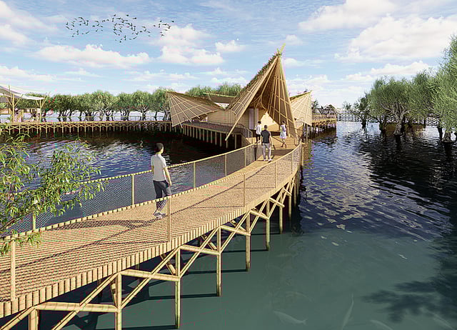 The model is complete with an amphitheater in the shape of the heron’s wings. The open pavilion, which can host informative programs, forums, seminars and alternative learning lectures, was structured to accommodate birds flying in and resting on its webbed bamboo. It likewise features integrated wooden swings that allow users to mimic the experience of birds perching on branches. It has boardwalks made from bamboo and natural woods that act as a runway to tour around the sanctuary.