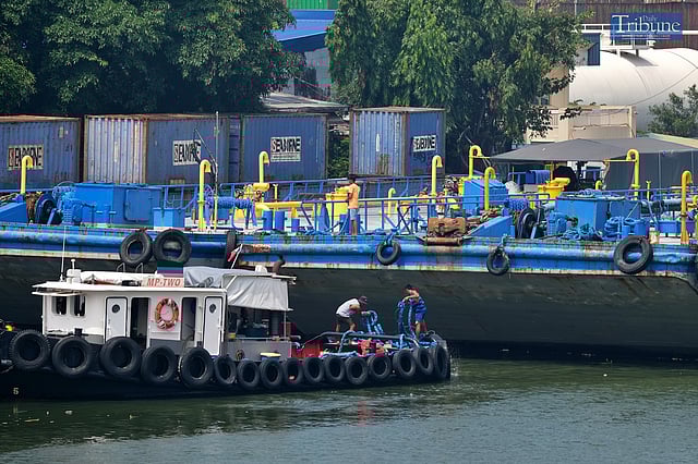 Tugboat personnel loosen the tie from their boat to the huge barge after they successfully manage to properly park the barge on a section of the Baseco Compound in Manila on Tuesday. KING RODRIGUEZ