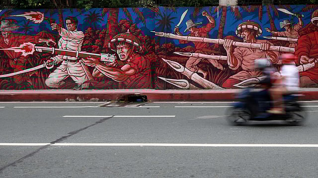 LOOK: Pedestrians and motorists pass by a mural depicting the 'himagsikan' led by heroes Andres Bonifacio and Gregorio del Pilar in San Juan City on Sunday, 25 August 2024, a day before the country celebrates National Heroes Day.