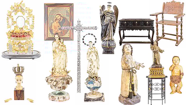 One of the oldest artifacts up for bidding is a santo from Laguna -- a late 18th to early 19th century processional figure of the patron saint of builders, San Vicente de Ferrer, its expressive face and hands delicately carved in ivory with a painted hardwood body and base, silver hall and signature wings crafted in tin.
