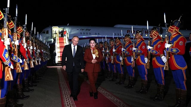 Putin was welcomed by an honor guard as he landed in Ulaanbataar the night before to begin the high-profile trip, seen as a show of defiance against the court, Kyiv, the West and rights groups that have all called for him to be detained.