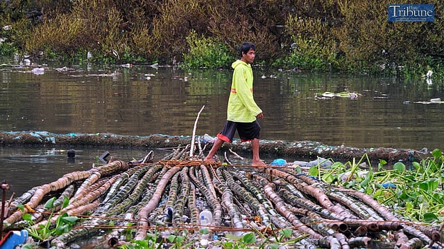 Balsa makers transport piles of bamboo poles along Manila Bay in Parañaque on Wednesday, 4 September 2024. Balsa, or floating shanties, are increasingly appearing around the Manila Bay area. KING RODRIGUEZ