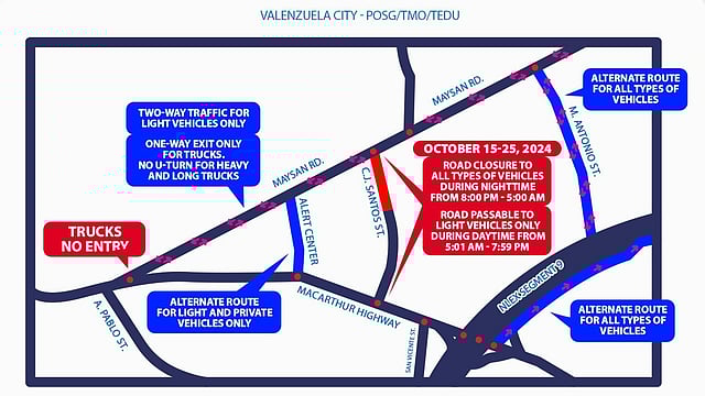 According to the local government, CJ Santos Street will be closed to all vehicles from 8 p.m. to 5 a.m. on 25 October and motorists heading to Barangays Maysan and Paso De Blas can use CJ Santos Street as an alternative route.