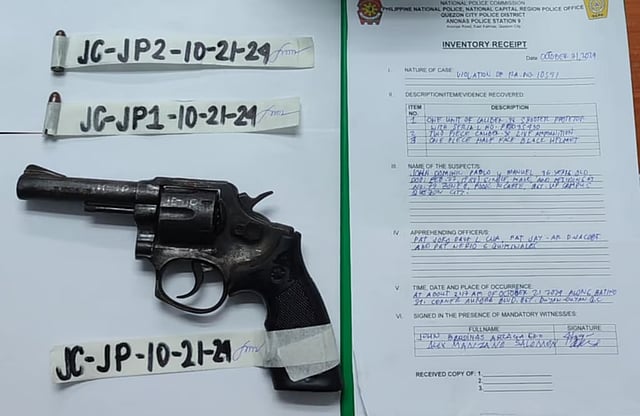 Upon conducting a search, a police officer recovered one (1) caliber .38 revolver loaded with two (2) live ammunitions and a half face helmet. When asked for the documents of the firearm, the suspect was unable to provide any.