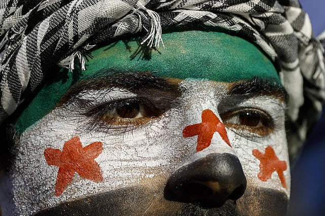 A man has his face painted with the opposition flag as members of the Syrian community and supporters gather to celebrate the fall of Syrian president Bashar al-Assad in the face of an offensive by Islamist-led rebels, in Istanbul's Fatih district on 8 December 2024. Islamist-led rebels toppled Syria's longtime ruler Bashar al-Assad in a lightning offensive that a UN envoy called "a watershed moment" for the nation marred by civil war.  Kemal ASLAN / AFP