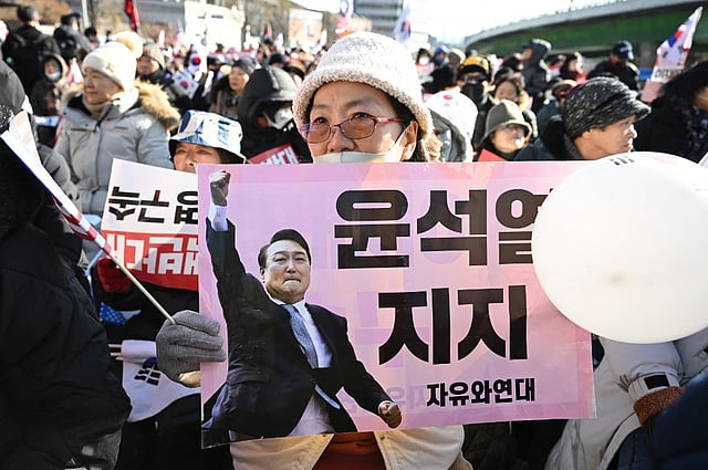 A supporter of impeached South Korea President Yoon Suk Yeol holds a placard showing a picture of the president as they gather near the presidential residence in Seoul on 31 December 2024. JUNG YEON-JE / AFP