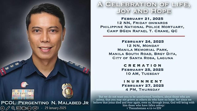 “To those who would like to pay their last respects in honoring the life of my husband, PCOL PERGENTINO N MALABED, JR, here are the details of his wake and inurnment. Viewing of Colonel Malabed’s remains will take place at the Philippine National Police Mortuary in Camp Crame from February 21 to February 23. For our families and friends, thank you for your prayers and love but certainly, your presence means so much to us during this time.”