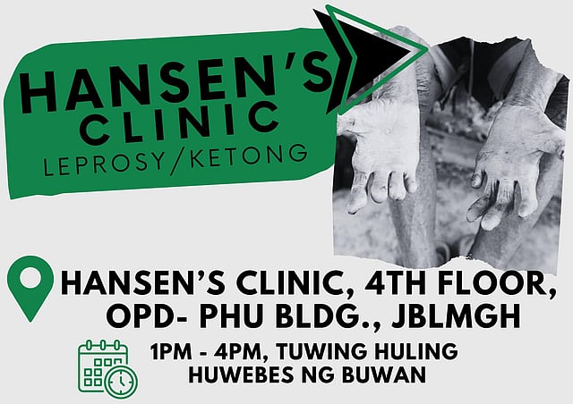 Hansen’s Clinic is located on the 4th floor of the Outpatient Department-Public Health Unit Building of JBLMGH. It is open every last Thursday of the month from 1 p.m. to 4 p.m.
