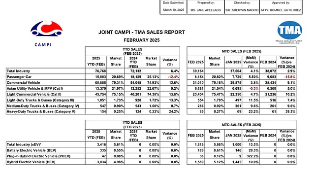 On Wednesday, a joint report by the Chamber of Automotive Manufacturers of the Philippines, Inc. (CAMPI) and the Truck Manufacturers Association showed that the industry sales data for February 2025 reveals that year-to-date sales have shown an overall positive trend with a total of 76,768 units, marking a 6.4 percent increase from the previous year's 72,132 units.